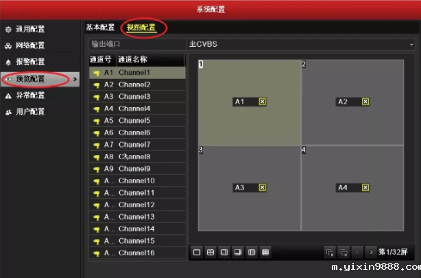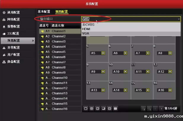 比如我们看到一款8路的录像机在参数里显示“支持1个HDMI和1个VGA同时输出”,那么怎么设置让HDMI显示器上显示1—4通道的画面,VGA显示器上显示5—8通道的画面呢?
