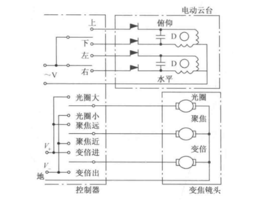 在一些特殊应用场合,系统中可能同时用到了云台及电动镜头或仅仅用到了电动镜头,因而控制器既要对云台进行控制,也要对电动镜头进行控制。