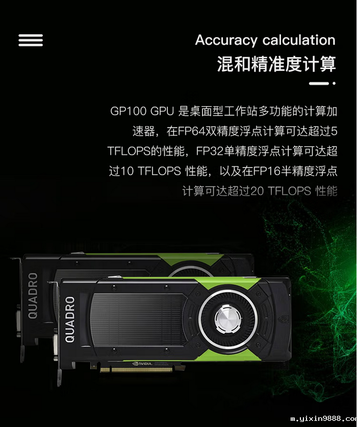 GP100容易让人误会,它并非是核心名,而品名就是Quadro GP100,作为这一家族的旗舰登场。Quadro GP100基于Pascal核心,单精度CUDA 3584个,双精度CUDA 1792个,半精/单精/双精浮点运算性能分别是20.7T、10.3T和5.2T,匹配16GB HBM2显存,带宽高达717GB/s,功耗235W。