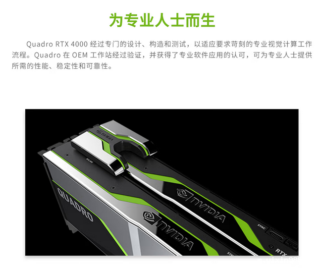 Quadro RTX 4000尺寸为4.4×9.5英寸,采用超薄节能的单插槽设计,适用于大多数工作站机箱。Quadro RTX 4000最大功耗为160W,仅依靠PCIe 3.0×16接口和单个8针PCIe电源连接器。显卡上的显示输出包括三个DisplayPort 1.4接口和一个VirtualLink USB-C接口。