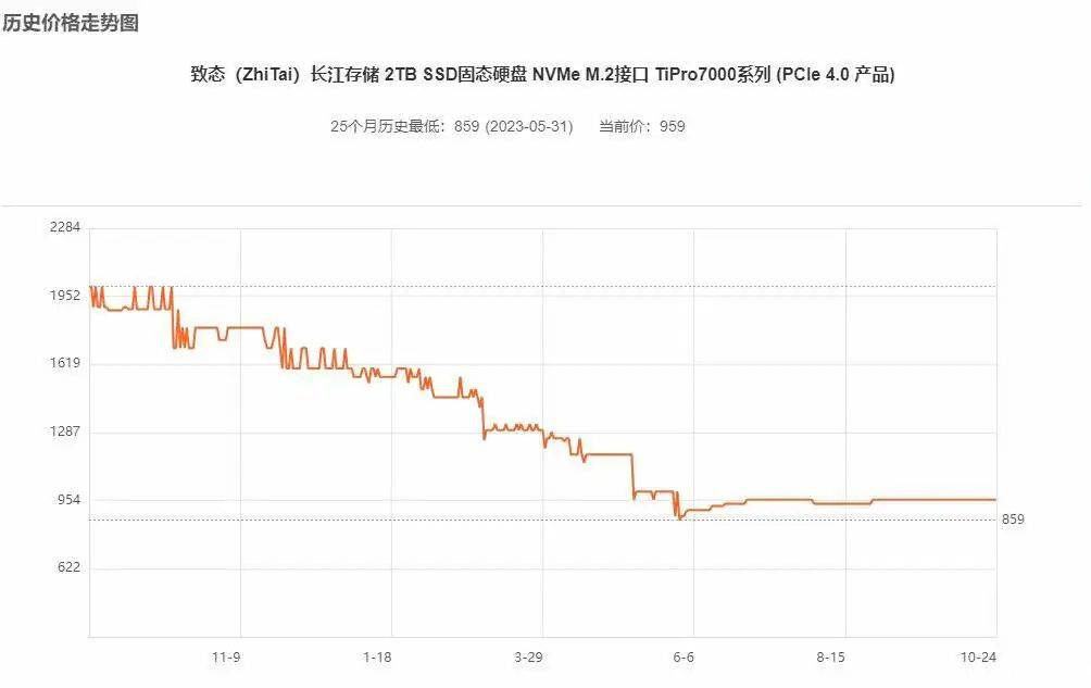 再来看国内长存旗下的致态品牌,同样是旗舰级PCIe 4.0固态硬盘产品TiPro7000,2TB容量在双十一售价为959元,对比618期间的859元正好涨了100元,并从大概8月下旬开始调升价格。