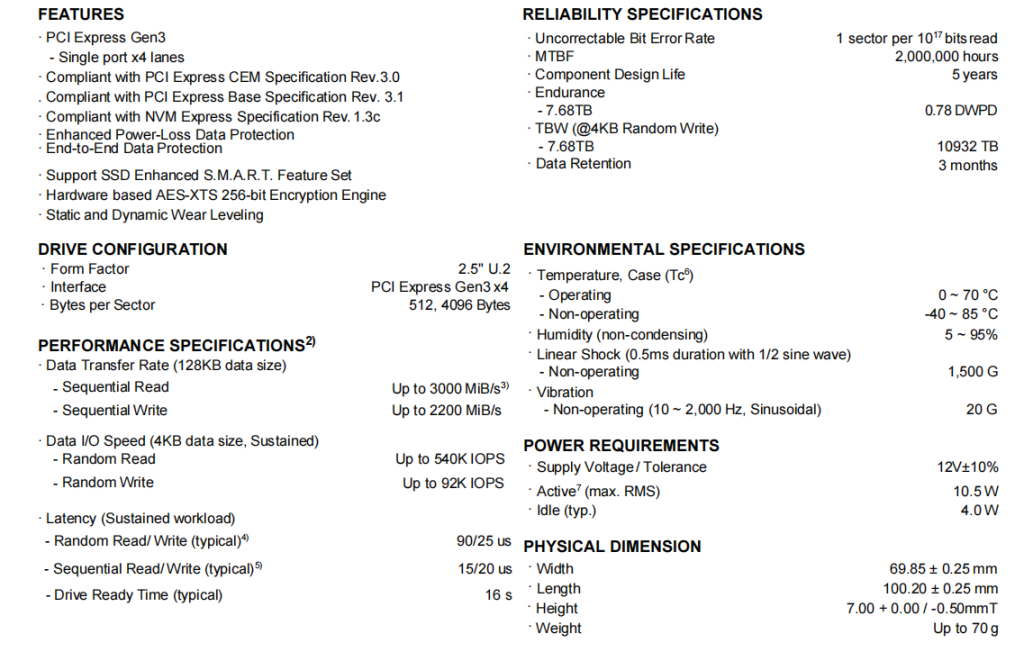 形态规格 :2.5英寸 U.2(SFF-8639接口)